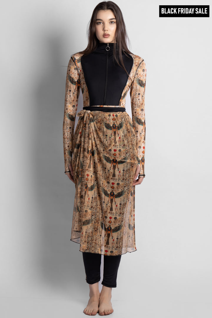IN THIS PIECE, REGAL BLACK MERGES WITH GOLDEN AND FIERY ACCENTS, FLOWING ACROSS THE SLEEVES LIKE MAJESTIC WINGS. THE DESIGN EMBODIES THE ESSENCE OF A RULER SOARING ABOVE BOUNDARIES, CARRYING BOTH STRENGTH AND FREEDOM IN EVERY DETAIL.